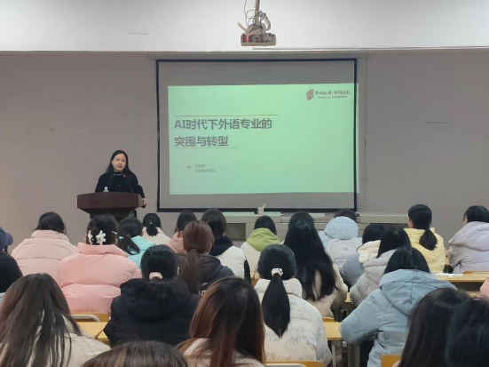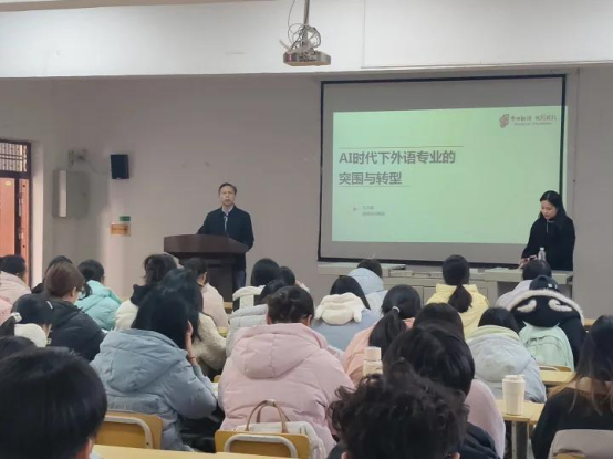 (外国语学院通讯员 呙小云 游 芳)我院为应对人工智能技术为外语领域带来的深刻变革,探索外语专业人才培养的新方向,2025年11月21日下午,译国译民集团总监王芷璇女士应学院邀请,在外院报告厅为我院师生带来了一场题为《AI时代下外语专业的突围与转型》的精彩讲座。讲座由外国语学院院长袁在成教授主持。