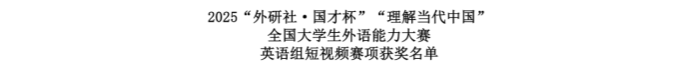(外国语学院通讯员 李丹阳)12月7日,2025年“外研社·国才杯”全国大学生外语能力大赛英语组短视频赛项圆满落幕,我校选送的作品从全国1100余所院校的17778部参赛作品中脱颖而出,荣获国赛银奖。